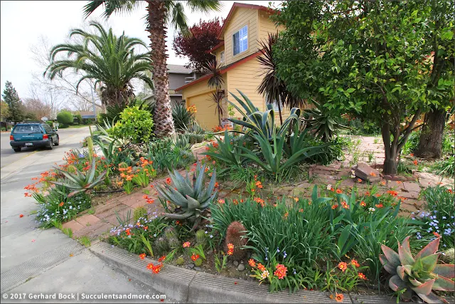 Marta remembers planting "a few" Sparaxis bulbs years ago, too over fourth dimension they receive got spread all over her forepart yard, both past times multiplying but to a greater extent than importantly through seed. As yous tin come across inwards some of the photos below, seedlings are directly growing inwards the cracks betwixt the pavers (as, incidentally, are seedlings of Echium wildpretii, aka towers of jewels).