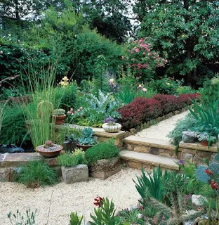Seasonal pots play an of import utilisation inward this garden. Morrow uses unmarried specimen plants inward smaller pots (less than xviii inches inward diameter) too exuberant mixtures of annuals too summertime exotics (bananas, palms, agaves too coleus) inward larger ones. In the winter, evergreen shrubs accept over the containers.